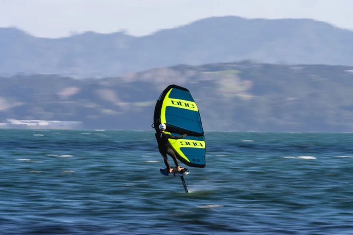 How Does The Hydrofoil Work? The underlying concepts of the hydrofoil are similar to the design of an aeroplane wing and much like the hydrofoils used in boating and yachting for many many years. The fins (wings) of the hydrofoil are shaped to create lift when passing through the water; the faster the speed, the higher the lift. Because water is much denser than air, a smaller wing is all that is needed to provide the necessary lift. Under the right conditions, the hydrofoil provides enough lift to raise the rider and board completely clear of the water. 3 Parts Of A Hydrofoil There are three main parts to the hydrofoil; the mast, fuselage, and the fins (or wings). As the name suggests, the mast forms the vertical shaft between the board and the fins. It is usually anywhere from 45cm up to 100 cm in height. The mast creates stability and allows for greater manoeuvrability in the water. Taller masts are best for more advanced riders. The fuselage is the middle section of the foil that connects the mast and the front and rear fins. The length of the fuselage affects the riding height and the responsiveness of the ride. Fins/Wings. The fins (or wings) of a hydrofoil sit at the front and back of the fuselage. The front wing is the larger of the two and has a shape similar to that of an aeroplane wing; it provides lift by deflecting water downwards as the foil passes through the water. The rear fin provides stability and affects the dynamics of the ride. The front and rear fin can be mixed and matched to customise your ride performance. A smaller rear fin can provide a looser response during turns for more advanced foiling, whereas a larger fin provides more stability for beginners. Choosing A Foil When it comes to choosing the best foil for your Wing Foiling kit, it's a bit of a trade-off between stability, manoeuvrability and agility. Beginners will want more stability, but the more advanced you get, the more you'll be looking for speed and turning capability, as well as the ability to pump the foil. Here are a few tips on choosing the right foil for you; however, ultimately, you will be guided by your level of progression. 4 Tips On Choosing The Best Foil Mast Length. A shorter mast is easier to learn on as it's more stable; a longer mast adds more manoeuvrability. Aim for around 60 to 80 cm for beginners. Fin/Wing Surface Area.The bigger the wing/fin, the more stability, the easier the ride and the more lift it generates. Smaller fins are faster and more manoeuvrable. Wing Aspect Ratio. Foil wings or fins have low, medium and high aspect ratios. Low aspect foils have a rounder shape offering more stability. The higher the aspect ratio, the higher the speed and the greater the responsiveness, which means the more difficult the ride. Fuselage Length.The greater the distance between the front and back wings, the greater the stability and less sensitive the foil is to movements in height. How Does The Inflatable Wing Work? When you first see a Wing Foiling inflatable wing, you'll find it looks a bit like a windsurfing sail; however it is shaped and constructed quite differently. Wing Foiling wings are extremely light and built around an inflatable framework that needs to be fully inflated to take shape, however, as the sport is still developing, there are some variations on equipment design and some wings may have a physical boom structure to increase structural stiffness. The inflatable wing works very similarly to a kite or sail in that it provides a collective barrier for the wind as it blows, which causes the wing to lift or pull in the direction the wind is blowing. This pulls the rider and board forward in the direction of the wind.