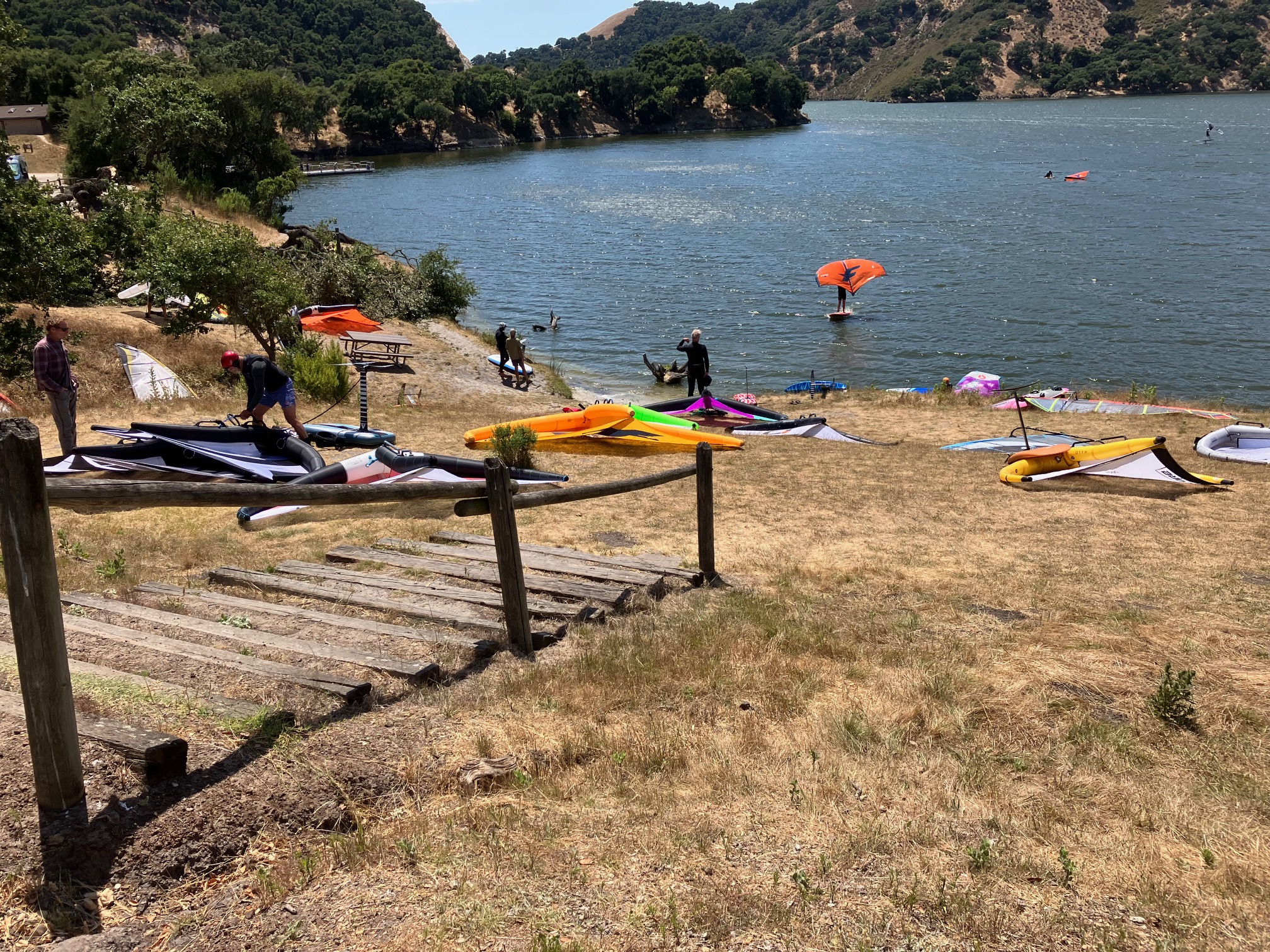 | Another beautiful day at the lake. Sunny and 82¡F. The wife went home last night to work today. The weekenders are gone and the weekday locals are out in force. Windsurfers paradise again. The wind bounced around from 8-10mph, then shot straight up to 21 mph for most of the day. The hillside is covered with wings begging to get in the water. I sail until about 5:30 pm, then pack up all the gear for the trip home. |